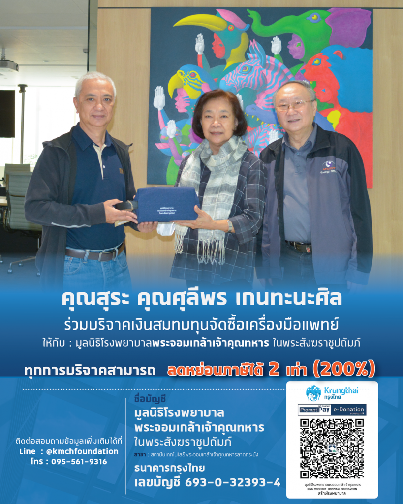 คุณสุระ คุณศุลีพร เกนทะนะศิล ร่วมบริจาคเงินสมทบทุนจัดซื้อเครื่องมือแพทย์ 27 มกราคม 202627 มกราคม 2026มูลนิธิโรงพยาบาลพระจอมเกล้าฯข่าวสารและกิจกรรม ร่วมบริจาคเงินสมทบทุนจัดซื้อเครื่องมือแพทย์ ให้กับ : มูลนิธิโรงพยาบาลพระจอมเกล้าเจ้าคุณทหาร ในพระสังฆราชูปถัมภ์ มูลนิธิโรงพยาบาลพระจอมเกล้าฯ กลับหน้าหลัก | ข่าวสารและกิจกรรม