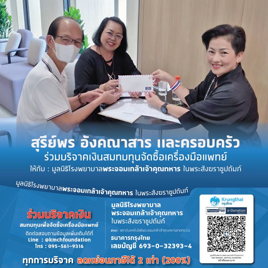 สุรีย์พร อังคณาสาร เเละครอบครัว 27 กุมภาพันธ์ 202627 กุมภาพันธ์ 2026มูลนิธิโรงพยาบาลพระจอมเกล้าฯข่าวสารและกิจกรรม ร่วมบริจาคเงินสมทบทุนจัดซื้อเครื่องมือแพทย์ ให้กับ : มูลนิธิโรงพยาบาลพระจอมเกล้าเจ้าคุณทหาร ในพระสังฆราชูปถัมภ์ Post Views: 0 มูลนิธิโรงพยาบาลพระจอมเกล้าฯ กลับหน้าหลัก | ข่าวสารและกิจกรรม